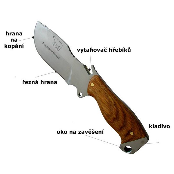 Navržen a vyroben jako kvalitní univerzální nástroj a díky tvaru čepele a hmotnosti může být použit jako kvalitní nůž na řezání lan, popruhů, drátů, slouží k sekání, jako páka a kladivo. V přední části na hřbetu čepele je umístěn zub, který umožňuje stahování kůže zvěře. Nůž je vyroben z chrom-molybden-vanadiové slitiny „vysoce pevná nástrojová ocel“ (50CH14MF) s antireflexním pokrytím.