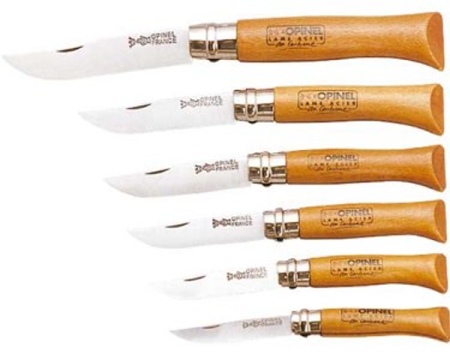 Zavírací nože různé velikosti. Čepel z kvalitní uhlíkové oceli. Střenka je vyrobena z jednoho kusu tvrdého dřeva a je chráněna speciálním lakováním. Nože z uhlíkové oceli se vyznačují stálou ostrostí. Nůž je opatřen pojistným kroužkem VIROBLOC.
